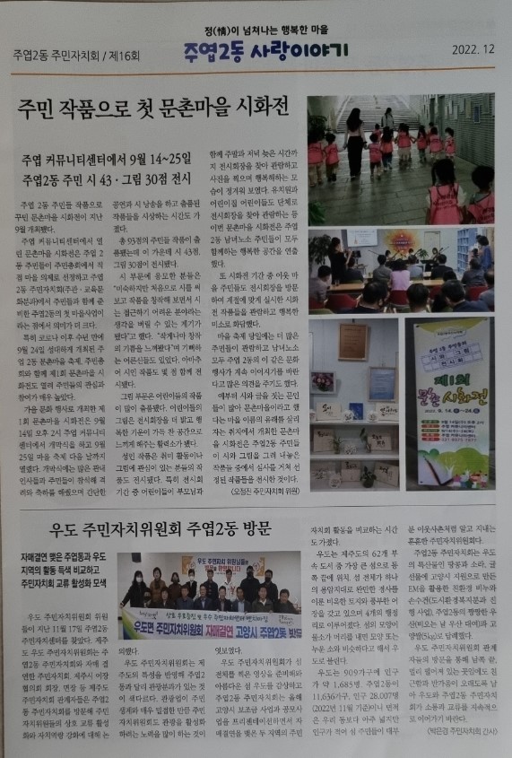 이번 호에는 3년 만에 열린 주엽2동 문촌마을축제 소식과 주민총회, 문촌마을 시화전 등 다양한 활동 소식이 실렸다. 또한 고양시 마을공동체 지원 사업으로 수확한 가을 무, 배추와 EM을 활용해 만든 친환경 비누를 관내 복지관에 기부하여 어려운 이웃과 독거 어르신들에게 전달한 훈훈한 내용도 소개했다.