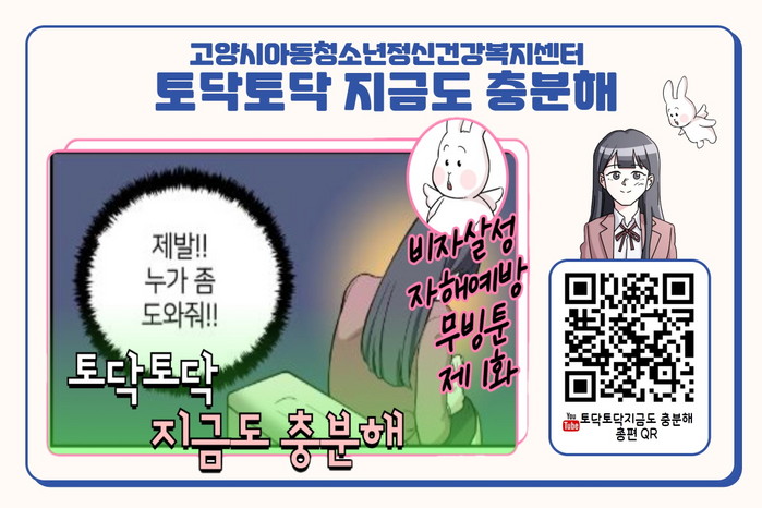 고양시아동·청소년정신건강복지센터의 웹툰 ‘토닥토닥 지금도 충분해’는 친구관계, 이별, 가족관계, 성적문제 등 복합적인 이유로 자해를 하게 된 주인공 ‘혜영이’와 그 가족이 자해문제를 해결하는 과정을 다루고 있다.