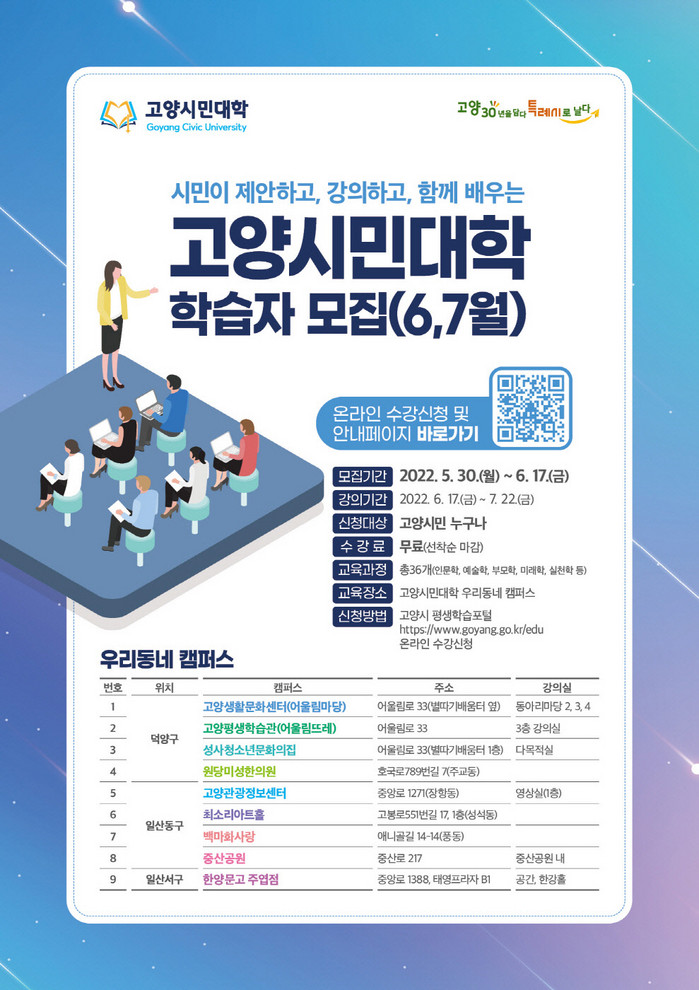 [부자동네타임즈 김인수기자] 고양시가 오는 5월 30일(월)부터 6월 17일(금)까지 2022년 고양시민대학 1기 학습자를 모집한다. 2022년 고양시민대학은 시민강사가 직접 제안한 강좌를 시민이 함께 배우는 시민참여형 학습프로그램이다.