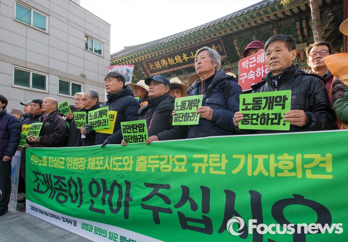 (서울=포커스뉴스) 8일 오후 서울 종로구 조계사 앞에서 진보 단체 회원들이 '한상균 민주노총 위원장 체포 시도와 출두강요 규탄' 기자회견을 갖고 있다.