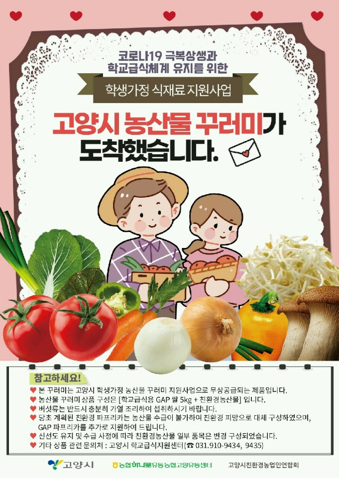 [부자동네타임즈 김인수기자] 고양시(시장 이재준)가 관내 유치원 및 초·중·고·특수학교 5만여 명의 학생 가정을 대상으로 5만 원 상당의 고양시 농산물 꾸러미 배송에 나섰다.