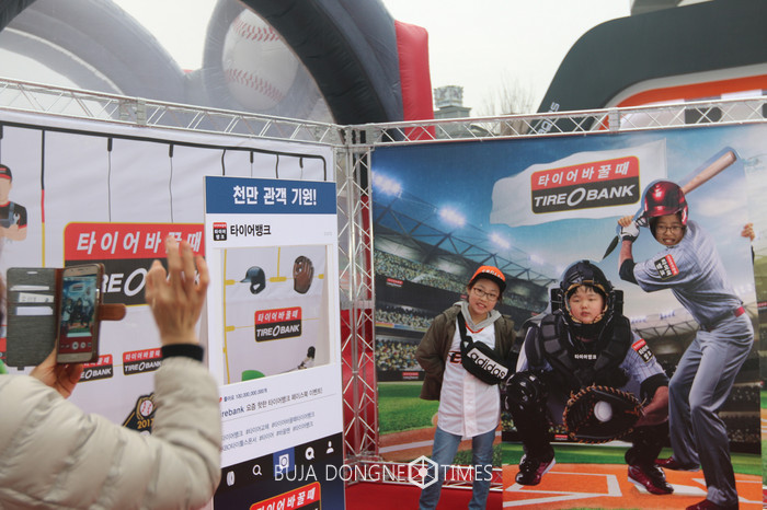 5일 대전 중구 부사동 한화생명이글스파크에서 열린 타이어뱅크, 에코백과 구급킷을 제공 이벤트에 참여한 가족이 포토존에서 기념 촬영을 하고 있다. 2017.04.05. (사진=타이어뱅크 제공)