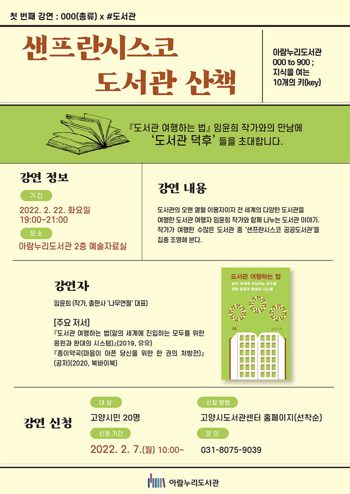 강연은 소규모 대면 방식으로 진행된다. 임윤희 작가가 여행한 세계의 수많은 도서관 중에서도 ‘샌프란시스코 공공도서관’을 집중 조명하며 동시에 우리 도서관의 오늘을 돌아본다.