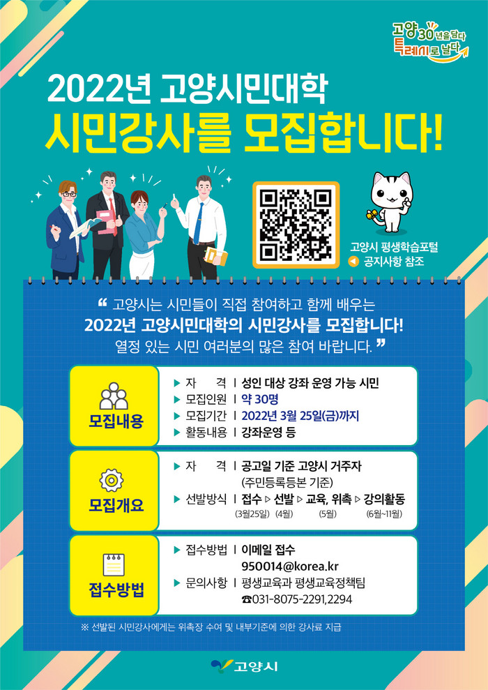[부자동네타임즈 김인수기자] 고양시가 2022년 고양시민대학의 시민강사 30여명을 오는 3월 25일까지 공개 모집한다.
