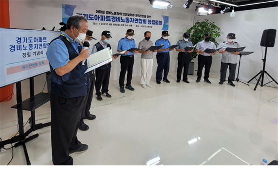 이번 창립총회는 코로나19로 인해 지역별 대표단 참석과 유튜브 생중계로 진행됐으며, 1부 임원 선출·정관 심의·하반기 사업계획 심의가 진행됐고, 2부에서는 축하 발언과 임원 인사, 경기도 아파트 경비노동자 권리선언 낭독이 이어졌다.