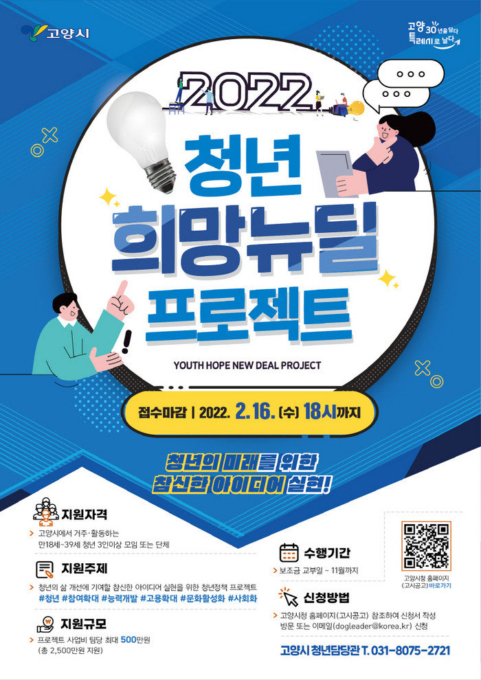‘청년 희망뉴딜 프로젝트’는 청년단체나 청년모임에게 다양한 아이디어를 실현하고 발전시킬 수 있는 기회를 주기 위해 고양시 청년 기본 조례에 따라 추진하는 지방보조금 공모사업이다.
