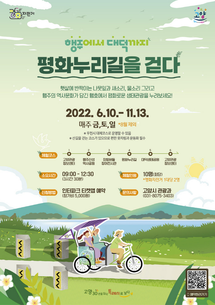 또한 6월 중순부터는 미개방 지역이던 군철책을 따라 걷는 DMZ 평화의길 도보 프로그램과 323천㎡의 면적에 새롭게 조성된 수변공간 고양한강평화공원, 행주방문자센터로 리모델링된 행주군막사를 선보이는 코스 등을 엮어 한강하구의 평화와 생태, 역사가 흐르는 명품 관광코스를 선보일 예정이다.