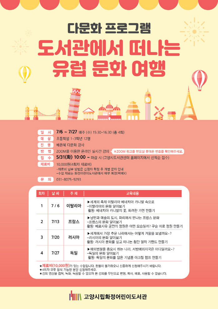 [부자동네타임즈 김인수기자] 고양시 화정어린이도서관이 다문화 프로그램 도서관에서 떠나는 유럽 문화 여행을 운영한다. 프로그램은 초등학생 1~3학년을 대상으로 운영하며 매주 다양한 놀이 활동을 통해 문화 다양성을 존중하는 태도를 기른다.