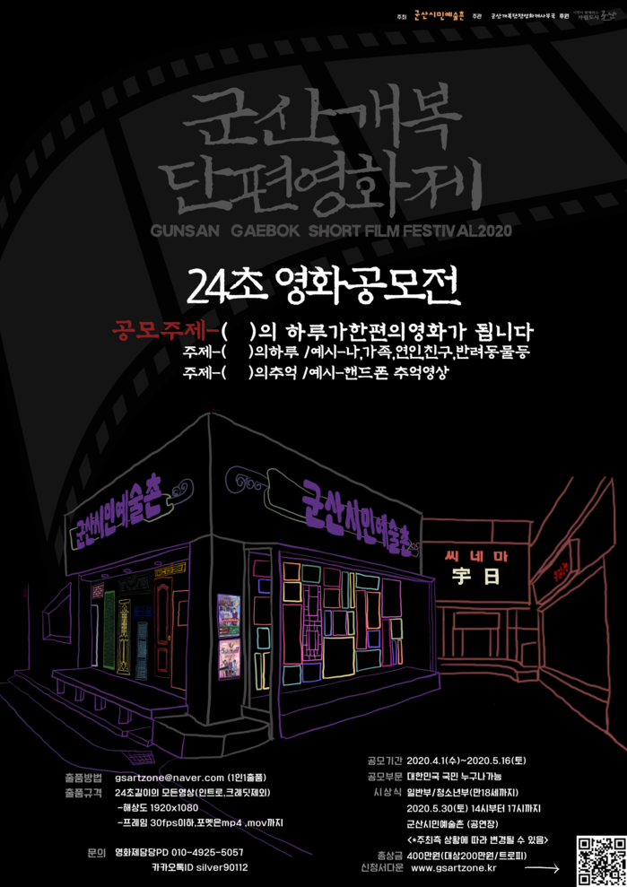 [부자동네타임즈 김인수기자] 군산시민예술촌(촌장 박양기)은 4월 1일부터 5월 16일까지 대한민국 국민 누구나 참여 가능한 24초 영화를 공모하여 5월 30일 토요일 오후2시부터 군산개복단편영화제를 개최한다.