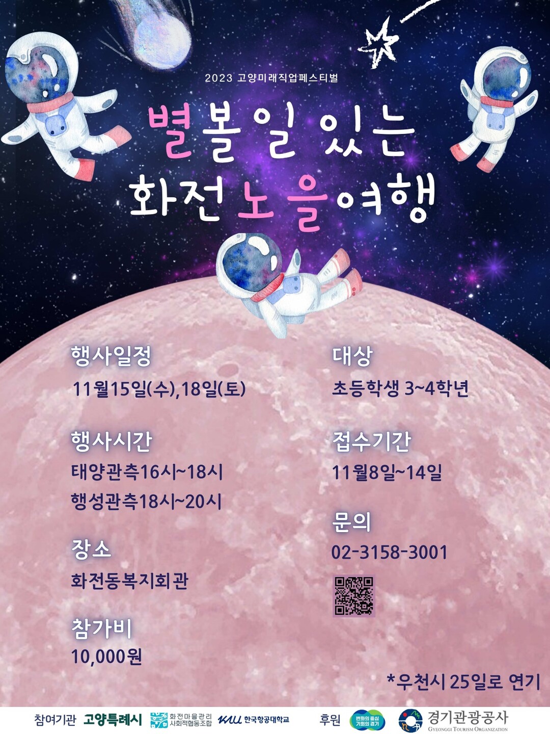 ‘별 볼 일 있는 화전 노을 여행’은 11월 15일과 18일 화전동복지회관에서 개최된다. 오후 4시부터는 노을 관측, 오후 6시부터는 행성·성단 관측이 진행된다. 초등학교 3~4학년을 대상으로 천체이론교육, 태양계 레이스 보드게임, 태양계 키링 만들기, 옥상 천체 관측도 실시된다.