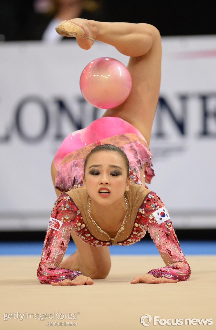 | △ <슈투트가르트/독일=게티/포커스뉴스> 국제체조연맹(FIG) 2015 리듬체조 세계선수권대회에 출전한 손연재가 지난 9월9일 새벽(한국시간)에 열린 종목별 결선 볼 종목에서 연기를 펼치고 있다. (C)게티이미지/멀티비츠 |
