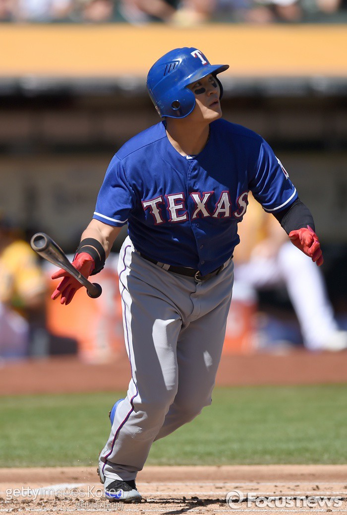 | △ <오클랜드/미국=게티/포커스뉴스> 텍사스 추신수가 9월25일(한국시간) 열린 오클랜드와의 경기에서 1회초 2루타를 때려내고 있다. ⓒ게티이미지/멀티비츠 |