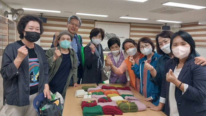 복지분과 위원들은 각자 바쁜 일정에도 틈틈이 목도리를 뜨고, 뜨개 꽃 장식을 달고 예쁘게 포장을 해 정성을 더했다.