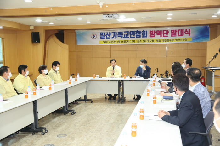 이를 위해 일산기독교연합회는 16일 일산동구청 다목적실에서 이재준 고양시장, 일산기독교연합회 교회 목사 및 총무, 일산동구청장, 일산서구청장, 보건소장 등 20여 명이 참석한 가운데 ‘코로나19 방역단 발대식’을 가졌다.