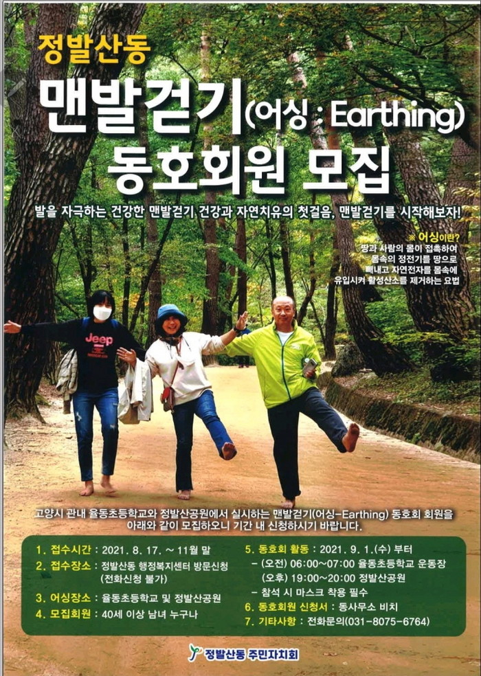 [부자동네타임즈 김인수기자] 고양시 일산동구 정발산동 주민자치회(회장 진윤숙)가 지역 주민의 건강 증진을 위한 어싱 동호회 회원모집을 시작한다.
