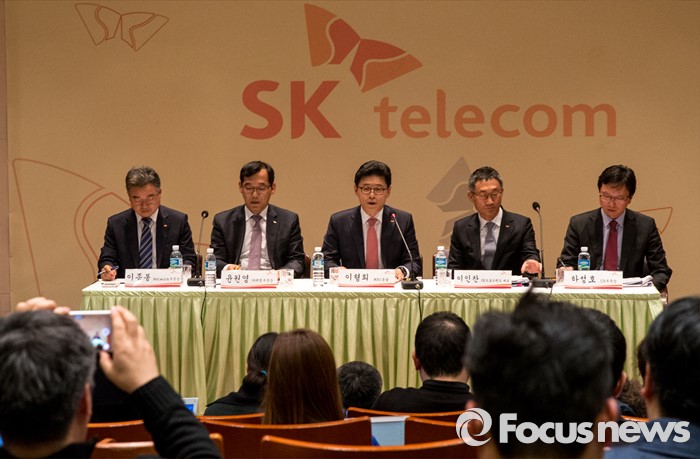 (서울=포커스뉴스) 2일 오후 서울 중구 SK T타워에서 열린 'SK텔레콤-CJ헬로비전' 인수합병 설명회에 참석한 이형희 MNO총괄(가운데)이 취재진의 질문에 답하고 있다.