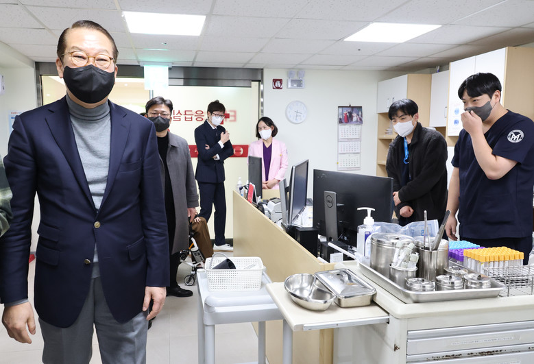 국민의힘 권영세 비상대책위원장이 27일 오후 서울 영등포구 인봉의료재단 영등포병원을 방문, 설 연휴 응급의료체계 현장점검을 하고 있다. 2025.1.27