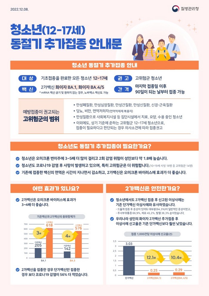 청소년 동절기 코로나19 추가접종 대상자는 12~17세 중 기초접종(2차)이상 완료자이며, 특히 면역저하자 및 기저질환자 등 고위험군 접종을 적극 권고하고 있다.