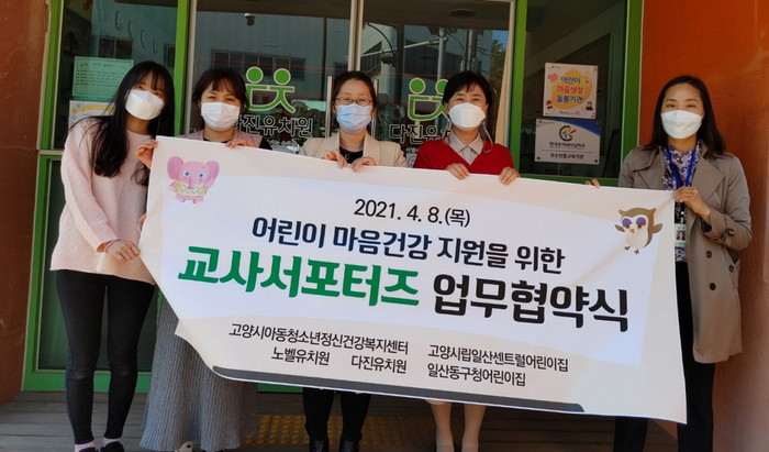 [부자동네타임즈 김인수기자] 고양시 아동.청소년 정신건강복지센터는 지난 8일 고양시시립일산센트럴어린이집, 노벨유치원, 다진유치원, 일산동구청어린이집과 어린이 마음건강 지원을 위한 교사 서포터즈 업무협약을 체결했다.