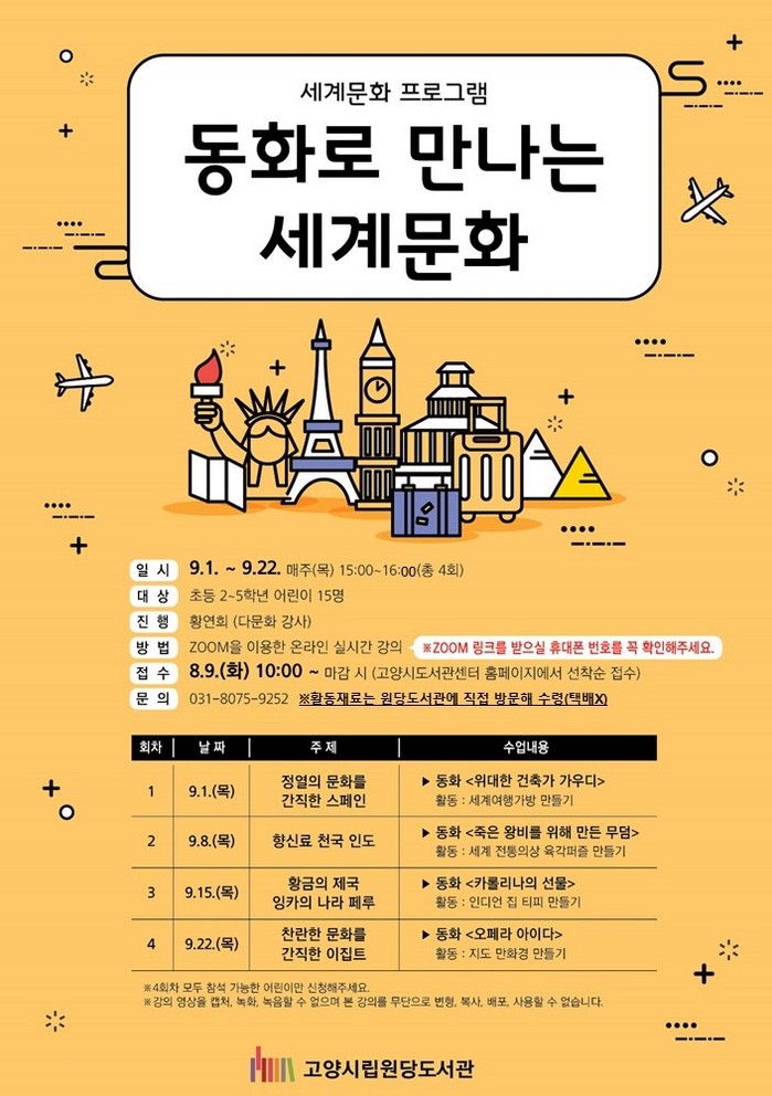 [부자동네타임즈 김인수기자] 고양특례시(시장 이동환) 원당도서관이 9월 1일부터 22일까지 어린이 다문화 프로그램인 동화로 만나는 세계문화를 온라인으로 운영한다.