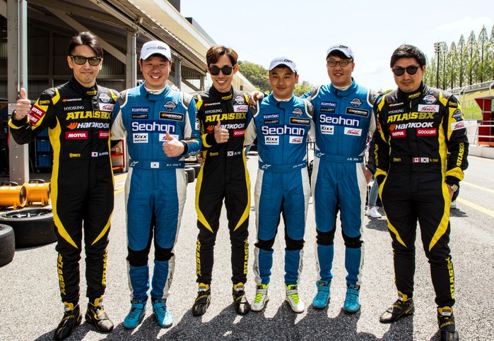 [사진설명] 아트라스BX 모터스포츠와 서한 GP의 드라이버들이 지난해 개막전에서 만나 함께 기념촬영하고 있다. 왼쪽부터 야나기다 마사타카, 장현진, 김종겸, 정회원, 김중군, 조항우.