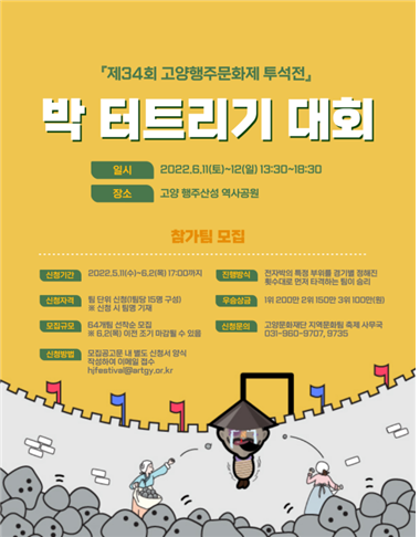 이번 행사는 행주대첩 속 ‘행주치마’와 ‘돌’을 활용해 시민들이 직접 돌을 던져 박을 터트려보는 재미와 교훈, 애국심을 경험해 볼 수 있는 기회로, 고양시가 주최하고 고양문화재단과 고양문화원의 공동주관으로 행주산성역사공원에서 오는 6월 11일부터 12일까지 양일간 개최되는 제34회 행주문화제의 대표 프로그램이다.