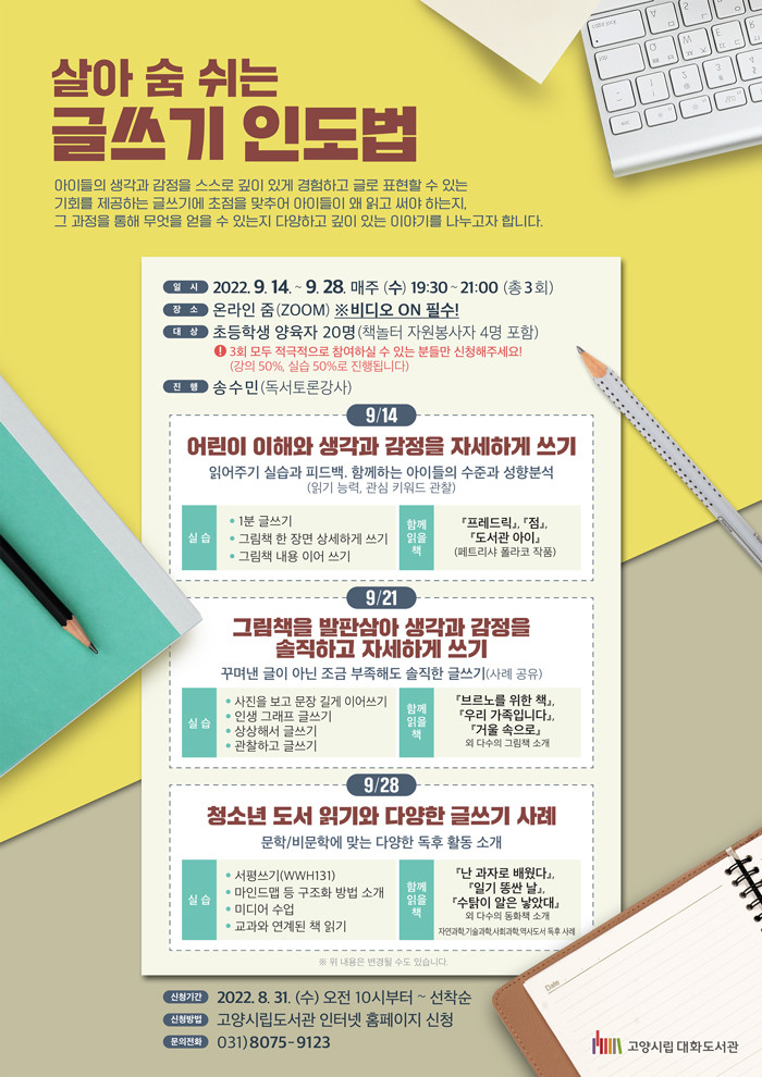 프로그램 신청은 오는 8월 31일 (수) 오전 10시부터 고양시립도서관 홈페이지에서 가능하며 기타 궁금한 사항은 대화도서관(031-8075-9123)으로 문의하면 된다.