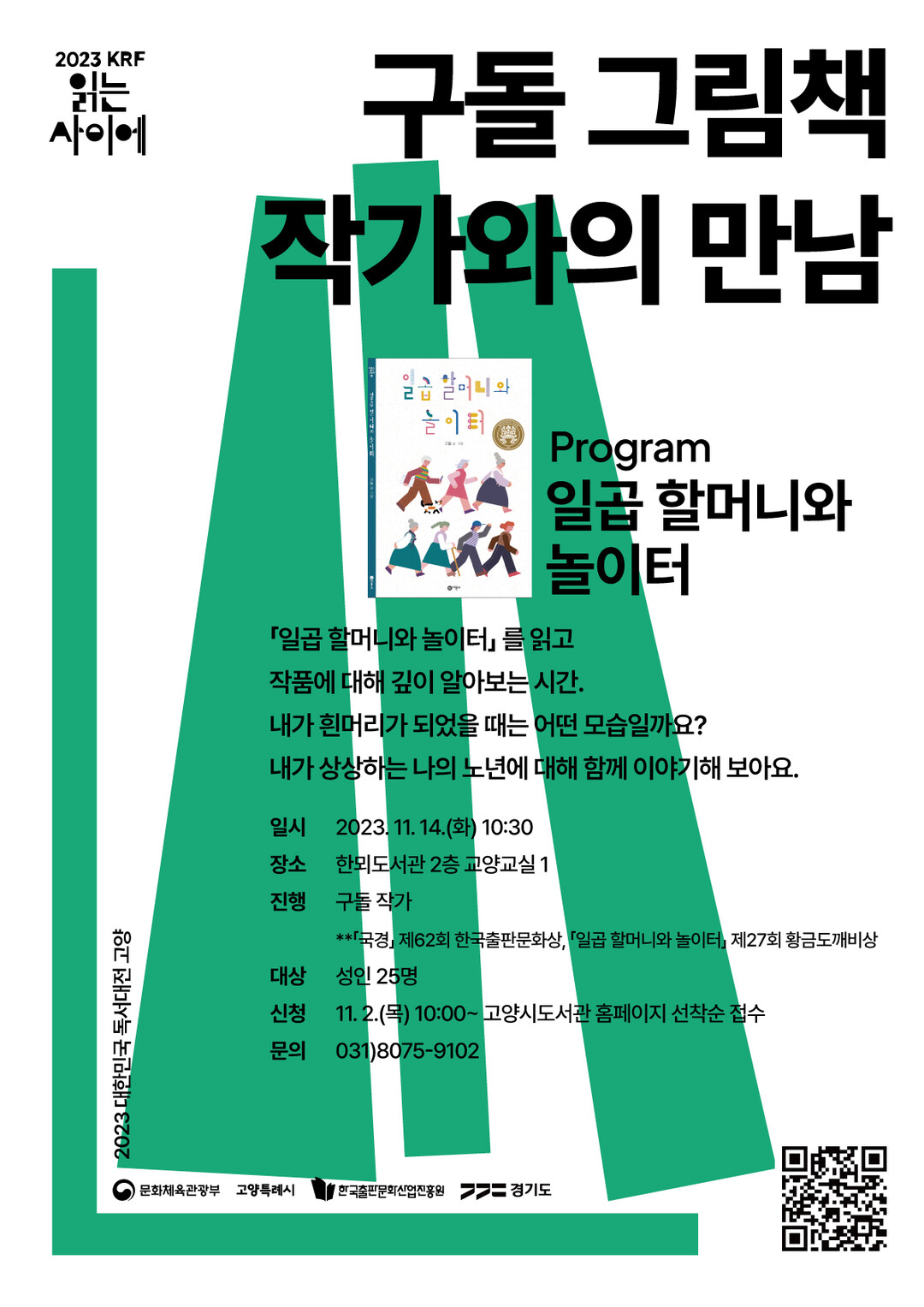 [부자동네타임즈 = 김인수 기자] 한뫼도서관은 2023 대한민국 독서대전 개최를 기념하여 ‘일곱 할머니와 놀이터’ 구돌 작가와의 만남 프로그램을 운영한다. 오는 11월 14일(화) 오전 10시 30분부터 성인 25명을 대상으로 진행된다.