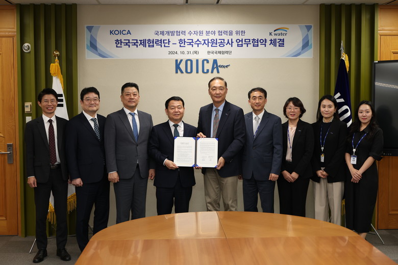 한국수자원공사(K-water, 사장 윤석대)는 한국국제협력단(KOICA, 이사장 장원삼)과 10월 31일 경기도 성남 한국국제협력단 본사에서 국제개발협력 활성화 등을 위해 ‘수자원 분야 국제개발협력사업 상호 협력을 위한 업무협약’을 체결했다.