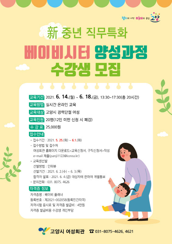 [부자동네타임즈 김인수기자] 고양시 여성회관은 내달 14일부터 경력단절 여성들을 대상으로‘베이비시터 양성과정’을 운영한다.