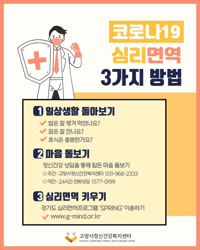 코로나19 확산으로 인한 시민들 사이에 불안감이 커지고 있다. 외부 활동이 줄어듦에 따라 무기력함을 느끼는 등 시민의 정신건강에 적신호가 켜진 상태에서, 고양시 정신건강복지센터는 심리적 면역력 향상을 위해 자가격리자와 일반 주민들을 대상으로 심리 상담, 정신건강 평가 서비스를 제공하고 있다.
