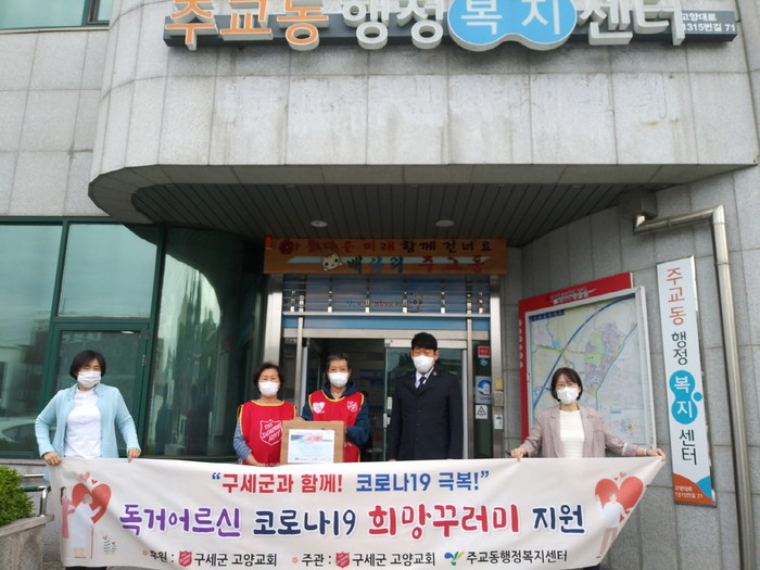 [부자동네타임즈 김인수기자] 코로나19 확산세가 좀처럼 꺾이지 않는 가운데, 지난 20일 고양시 덕양구 주교동행정복지센터(동장 정구학)에서는 구세군 고양교회(대표 정문수)와 함께 바깥 활동이 어려운 독거어르신들을 위해 ‘코로나19 극복 희망꾸러미’ 지원 사업을 펼쳤다.
