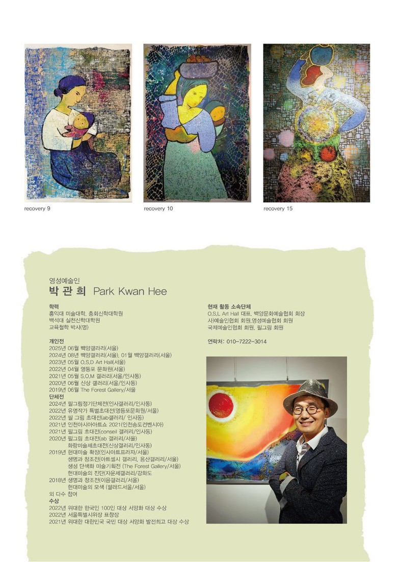 오는 6월 10일부터 21일까지, 영등포시장역 인근 백양갤러리에서 박관희 작가의 개인전 **‘회복의 길’**이 열린다. 이번 전시는 동명의 시(詩)인 회복의 길을 중심으로, 삶의 상처와 회복, 그리고 어머니의 사랑이라는 주제를 다양한 작품에 녹여낸 자리로 관람객들에게 잔잔한 감동과 위로를 전하고 있다.