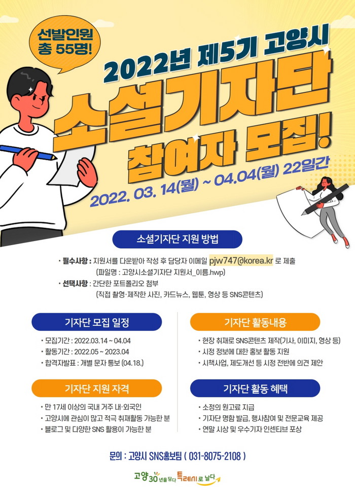 [부자동네타임즈 김인수기자] 고양시가 ‘제5기 고양시 소셜기자단’ 총 55명을 3월 14일(월)부터 오는 4월 4일(월)까지 선발한다. 지난 2017년 활동을 시작하여 올해로 5기를 맞이한 고양시 소셜기자단은 각종 시정 소식을 SNS를 통해 생생하게 전달하며 시와 시민 간 메신저 역할을 톡톡히 해내고 있다.