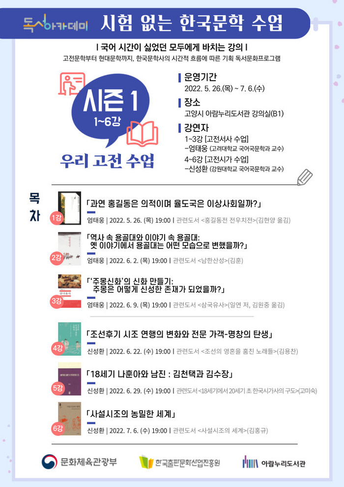 [부자동네타임즈 김인수기자] 고양시 아람누리도서관은 문화체육관광부가 주최하고 한국출판문화산업진흥원이 주관하는 2022년 독서아카데미 사업 수행기관으로 선정, 오는 5월 26일부터 시험 없는 한국문학 수업을 운영한다.
