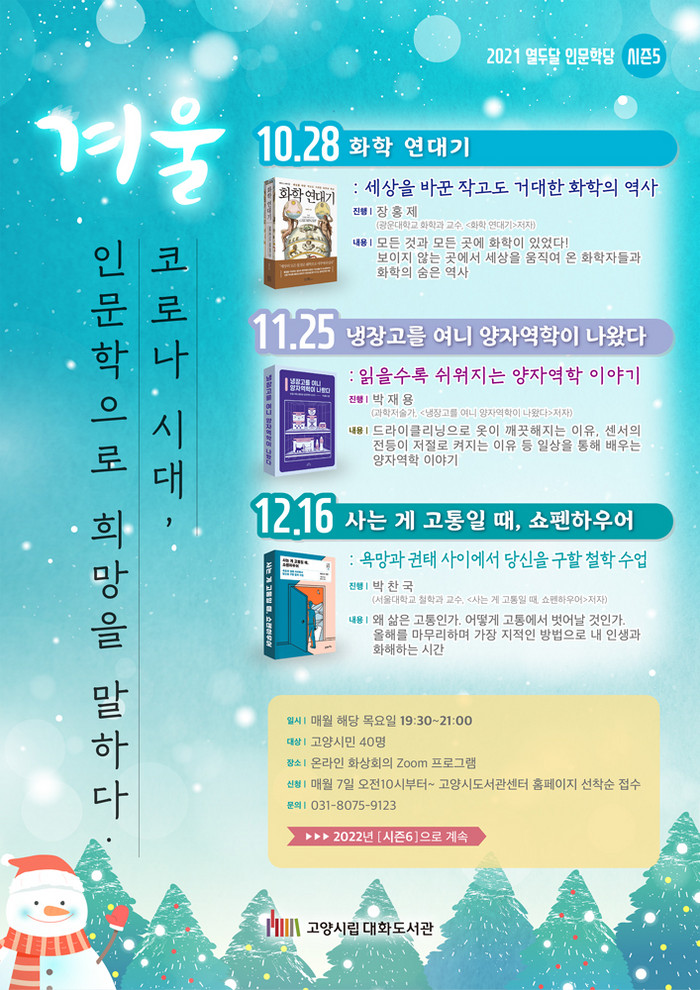 [부자동네타임즈 김인수기자] 고양시 대화도서관이 10월 28일(목)부터 12월 16일(목)까지 열두달 인문학당 겨울 편을 운영한다.