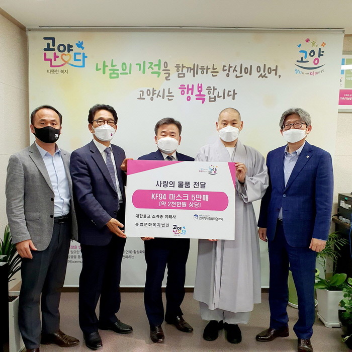 [부자동네타임즈 김인수기자] 고양시는 지난 11일 대한불교 조계종 여래사, (사)홍법문화복지법인에서 관내 취약계층 및 소외된 이웃을 위해 마스크 5만매를 기부했다고 밝혔다.