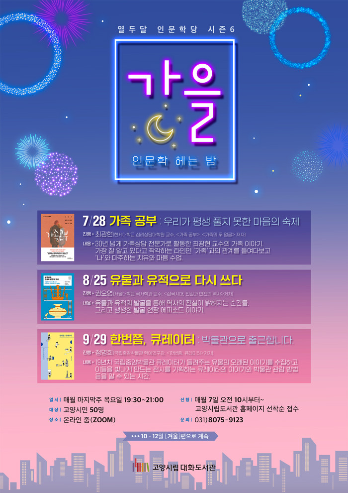 프로그램은 매월 마지막주 목요일 저녁에진행될 예정이다. 프로그램 신청은 7월 7일(목)부터 고양시립도서관 홈페이지에서 가능하며, 기타 궁금한 사항은 대화도서관 독서문화프로그램 담당자에게 문의하면 된다.