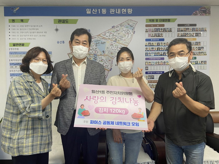 [부자동네타임즈 김인수기자] 고양시 일산1동 주민자치위원회(위원장 배영민)는 지난 12일, 파머스 공동체 네트워크 모임(대표 김정희, 양상국)에서 파김치 60kg과 갓김치 60kg, 총 120kg을 후원 받아 관내 소외계층 지원을 위해 기부했다.