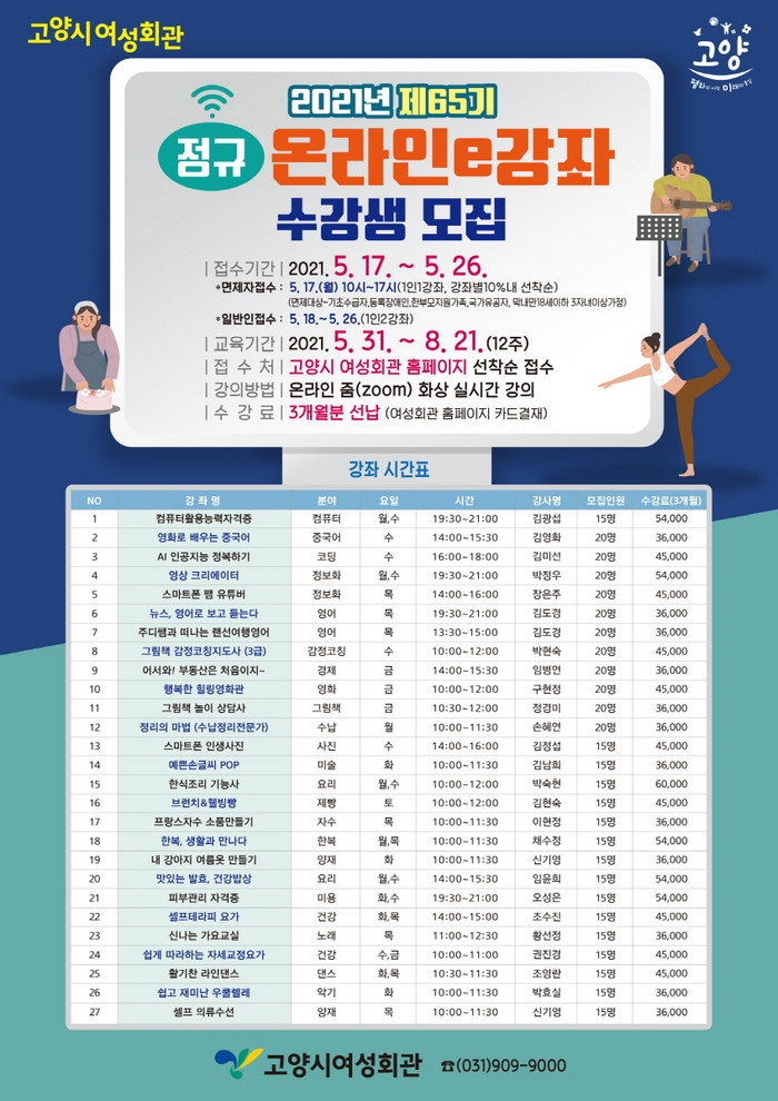 강의는 5월 31일부터 8월 21일까지 진행되며, 모집인원은 강좌별 15~20이다. 신청은 이달 17일부터 26일까지 고양시 여성회관 홈페이지에서 할 수 있다.