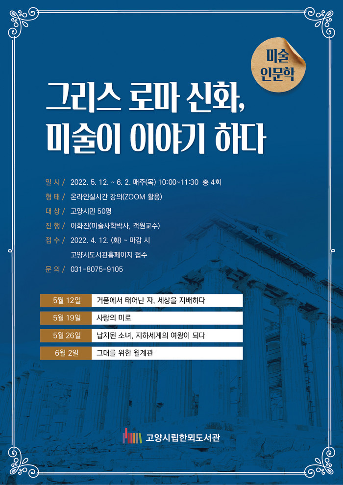 [부자동네타임즈 김인수기자] 고양시 한뫼도서관은 미술인문학 "그리스·로마신화, 미술이 이야기하다" 프로그램을 온라인으로 운영한다.