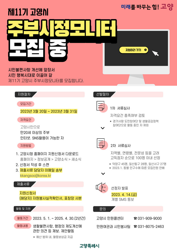 이번 제11기 고양시 주부시정모니터는 100명을 모집한다. 고양시민이면서 인터넷과 SNS 활용이 가능한 만 20세 이상 주부이면 누구나 신청할 수 있다. 선발된 11기는 2023년 5월 1일부터 2025년 4월 30일까지 2년간 활동한다.