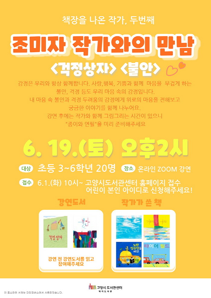 강연을 맡은 조미자 작가는 축하합니다, 언제나 하, 토비와 나, 어느 공원의 하루 등의 그림책 저자로 강연과 함께 어린이자료실에 작가의 책을 함께 전시해 시민들에게 소개할 예정이다.