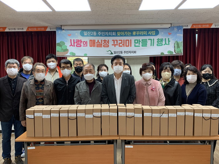 ‘매실청 꾸러미 만들기’행사는 3월 29일(화)에 실시된 일산2동 주민총회에서 채택된 사업으로 일산2동에 거주하는 독거 어르신들과 취약계층 60명을 대상으로 건강에 좋은 매실청 꾸러미를 직접 제작하여 전달하는 자치사업이다.