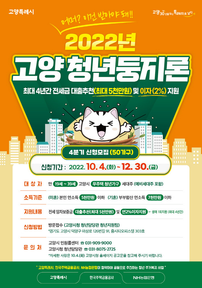 [부자동네타임즈 김인수기자] 고양특례시(시장 이동환)가 10월 4일부터 ‘고양 청년둥지론’ 사업의 마지막 4분기 지원가구 50가구를 모집한다.