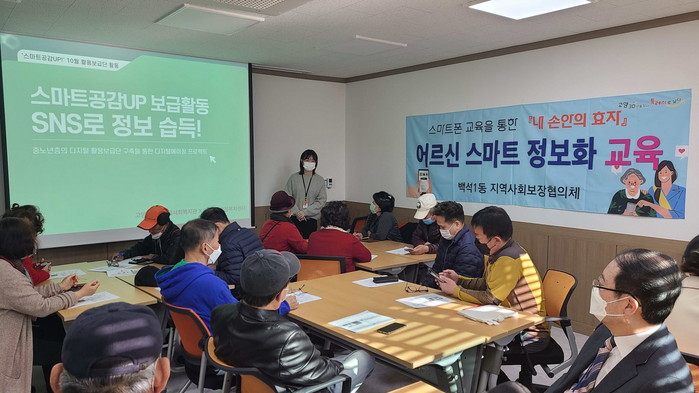 [부자동네타임즈 김인수기자] 고양특례시 일산동구 백석1동 행정복지센터(동장 한철희)는 고양시 흰돌종합사회복지관의 전문강사를 초청, 센터 내에서 10월 25일과 26일 이틀간 관내 어르신들을 대상으로 ‘어르신 스마트폰 정보화 교육’을 실시했다.