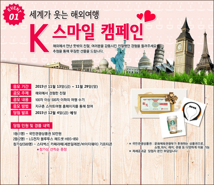 이번 이벤트 참가 희망자는 ‘지구촌 스마트여행 홈페이지(www.smartoutbound.or.kr)‘에 접속해 해외에서 경험한 친절을 주제로 한 여행 수기를 500자 이하로 등록하면 된다.