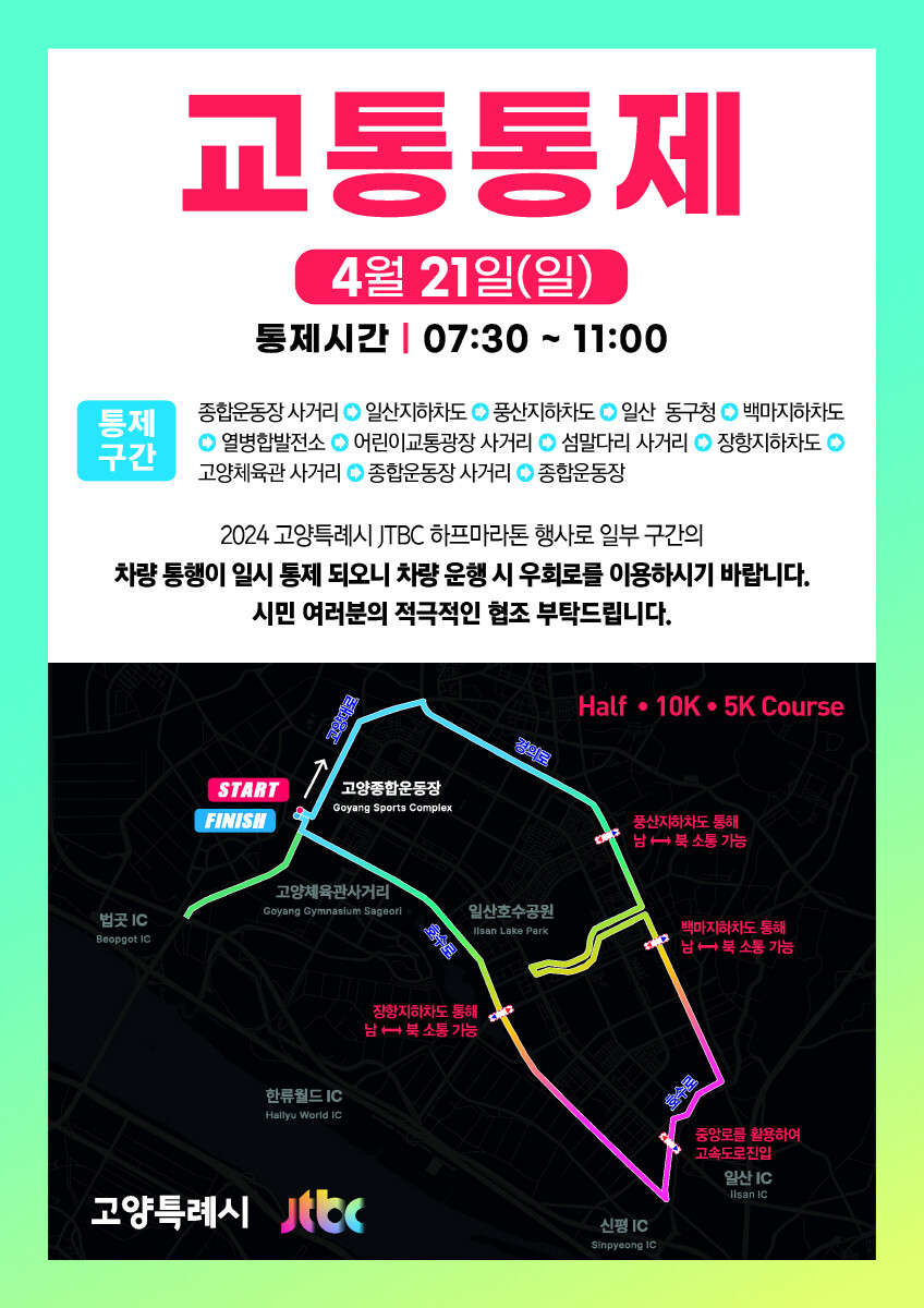 2024 고양특례시-JTBC 하프 마라톤 대회가 21일 개최됨에 따라 고양종합운동장 인근, 고양대로, 경의로, 호수로 등 고양시 주요 도로의 교통이 통제된다. 통제시간은 오전 7시 30분~11시다.