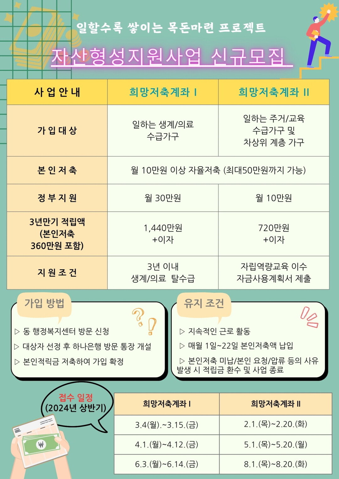신청기간은 희망저축계좌I은 3.4.~15.(1차), 4.1.~12.(2차), 6.3.~14.(3차), 8.1.~13.(4차), 10.1.~14.(5차) 희망저축계좌II는 2.1.~20.(1차), 5.1.~20.(2차), 8.1.~20.(3차) 이다. 이외에도 5월에는 가구소득 기준에 따라 15세~39세의 일하는 청년을 대상으로 청년내일저축계좌 신규 대상자를 모집할 예정이다.
