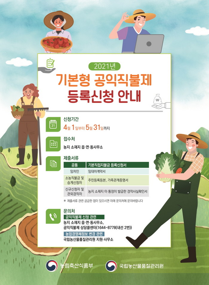 ‘기본형 공익직불제’는 농업인 등의 소득안정과 농업·농촌의 공익기능 증진 강화를 위해 농민에게 보조금을 지원하는 제도로 면적직불금과 소농직불금으로 나눠 신청할 수 있다.